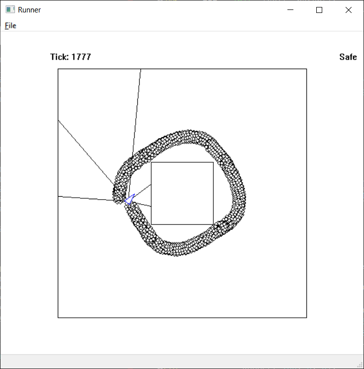 Most of the randomly generated runners switched from circles to oval or even kidney shaped patterns, but one of them managed to get around the maze in tight circles. It didn’t hit the wall but it came damn close.